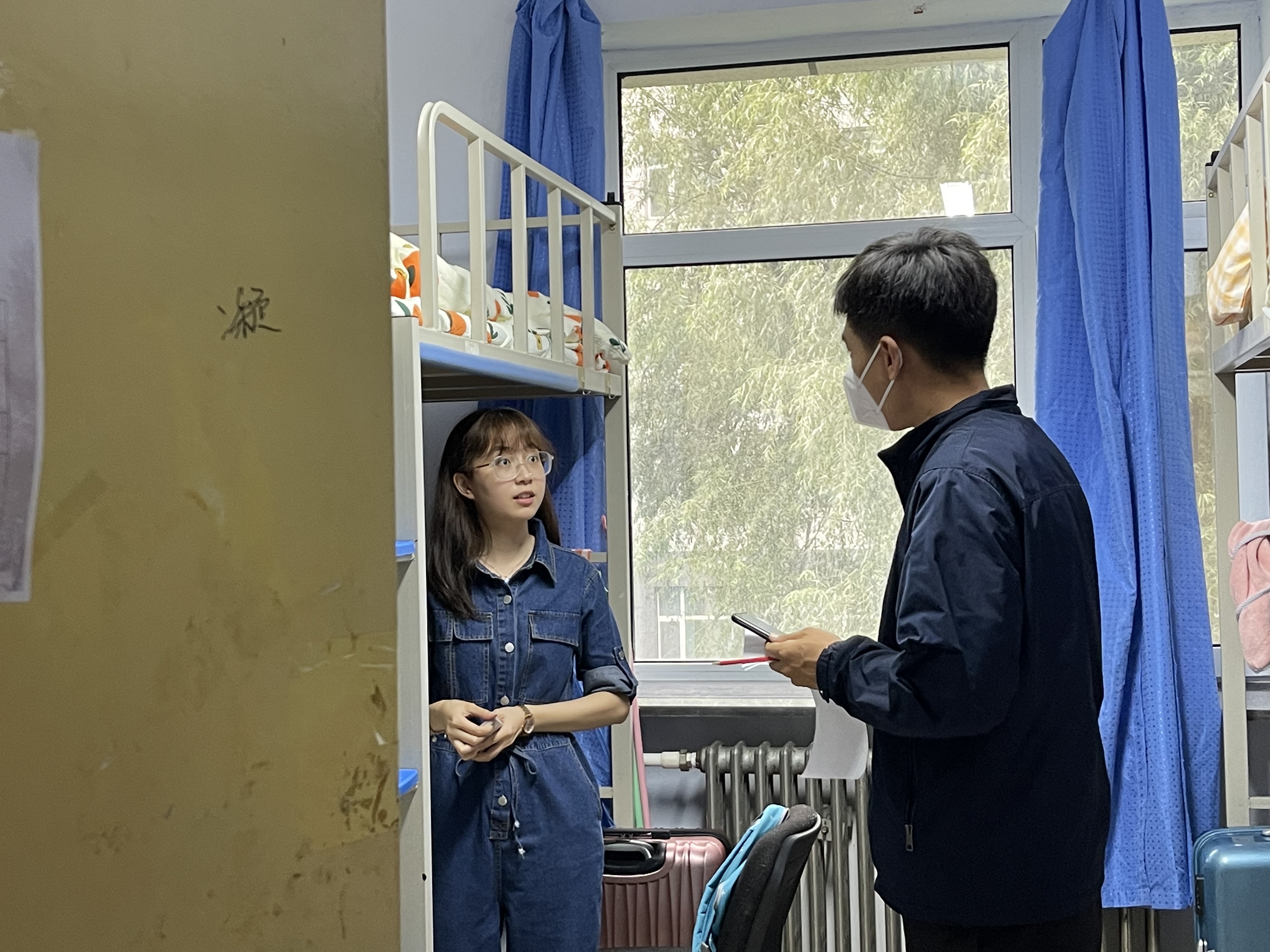 学生工作办公室主任王一涵和年级辅导员楚恒叶、刘宇走访了南三、北二两栋新生学生寝室。