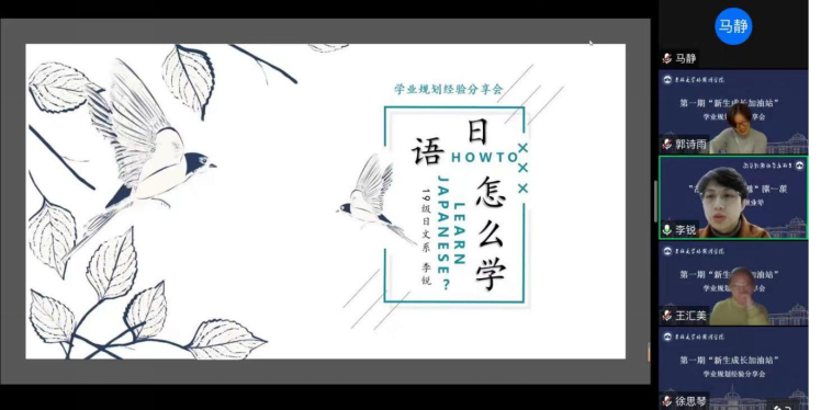 2020级英文系刘骥同学主持,2019级英文系徐焱冰、2019级俄文系马静、2019级日文系李锐、2019级西文系徐政奇、2019级朝文系李涵做学习经验分享。2022级学生辅导员刘宇老师、澳门金沙娱乐城app