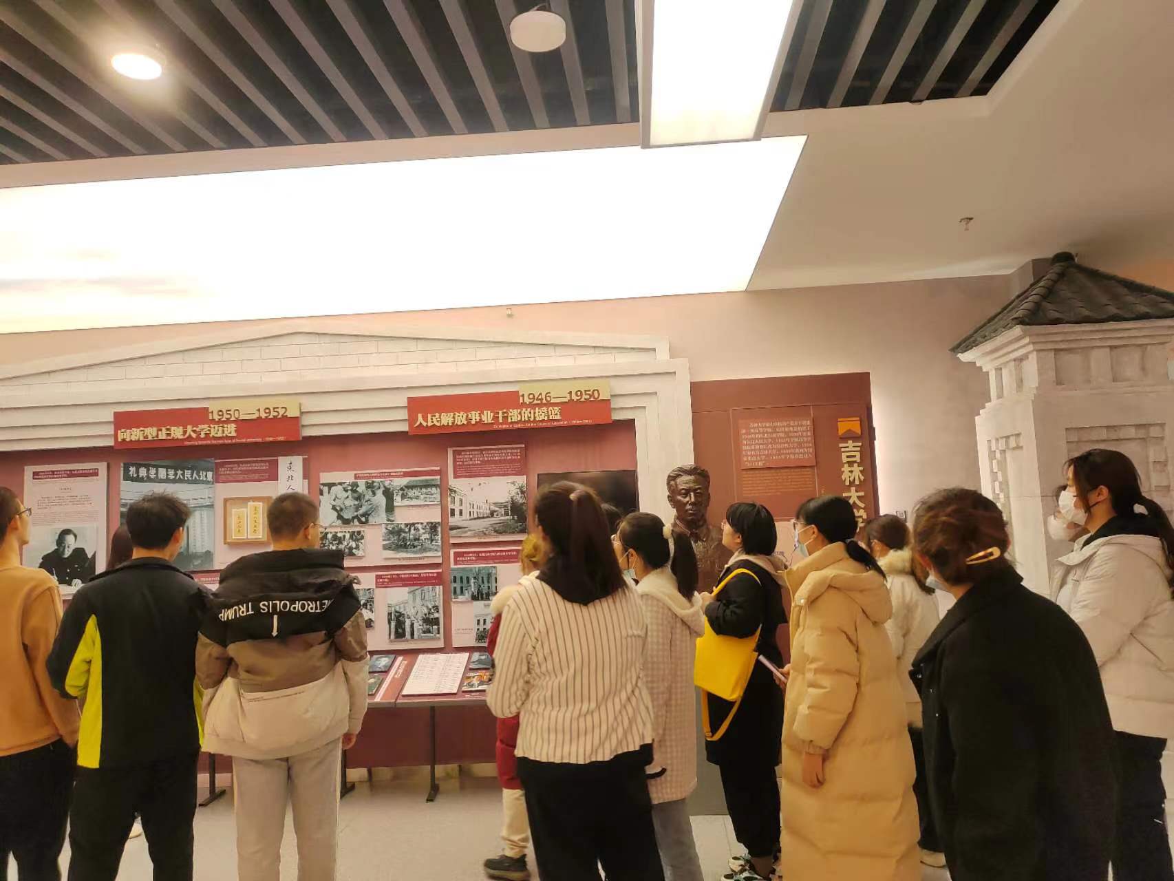 校史馆的展览以吉林大学的校徽和校训为开篇,馆内设有杏坛翘楚、光辉岁月、继往开来、星光璀璨等十余个展区。参观过程中,同学们认真倾听讲解员的讲解,深切体会学校厚重的历史积淀、丰硕的办学成果和奋发的进取精神。最后同学们在校史馆门口合影留念。