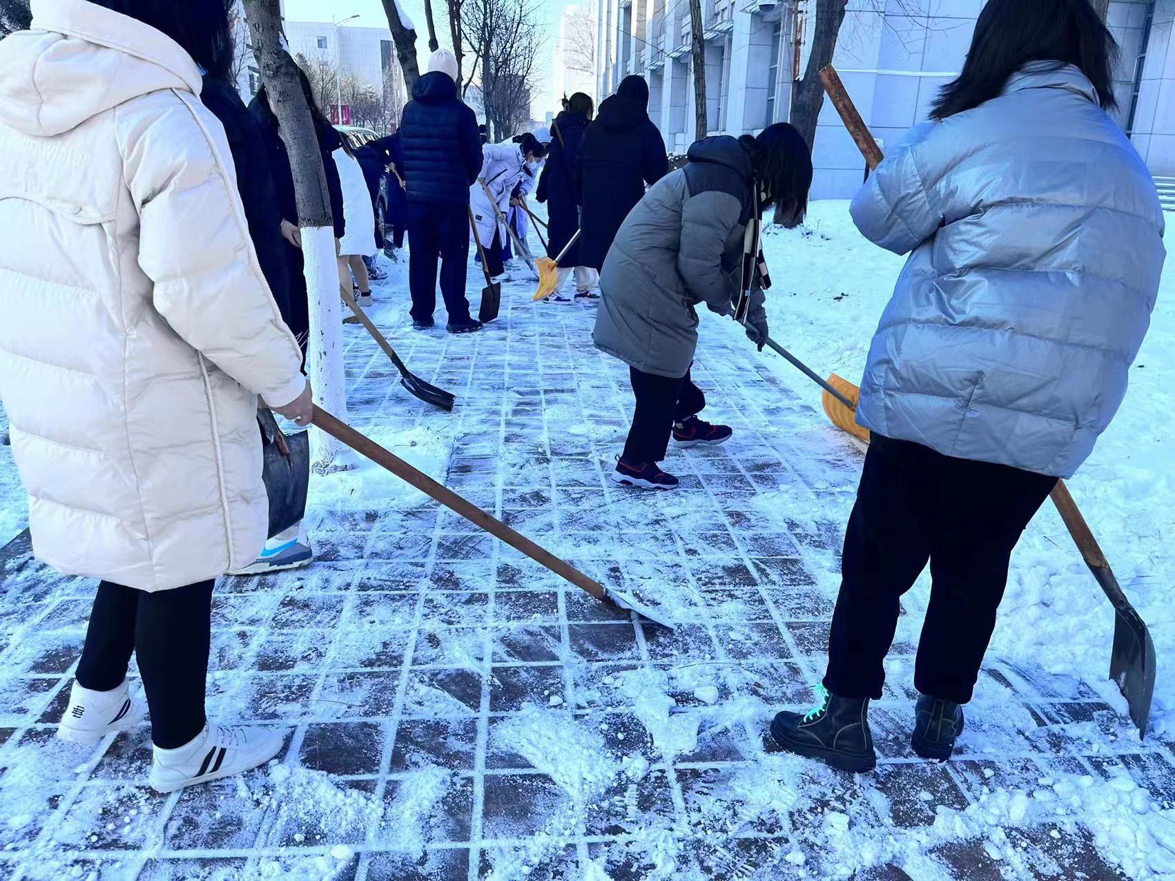 新生各班积极响应,协同联动,第一时间到积雪现场报到,划片区合理分工,齐心协力清除了外语楼周边区域的积雪,经过共同努力,外语楼周边主干道及公共区域被清扫干净,校园道路得以正常通行。