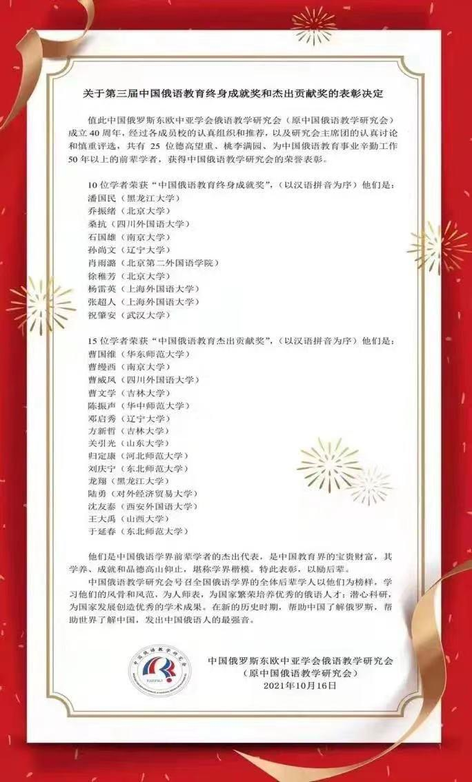 本次大会颁发了第三届中国俄语教育终身成就奖和杰出贡献奖,共有来自全国17所高校的25名德高望重、为中国俄语教育事业辛勤耕耘50年以上的学者获得表彰。其中吉林大学俄文系曹文学教授、方新哲教授实至名归,荣获“中国俄语教育杰出贡献奖”。