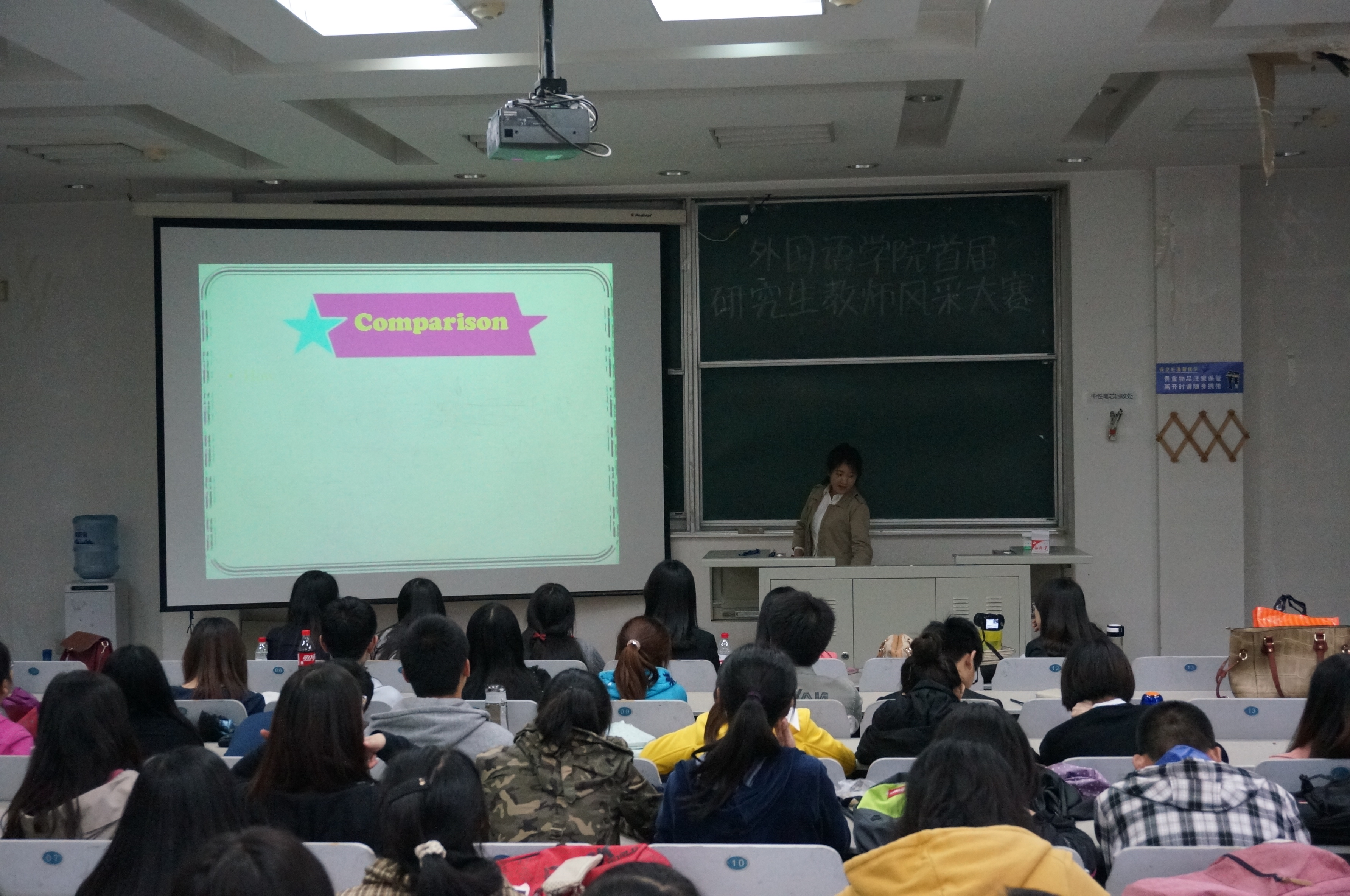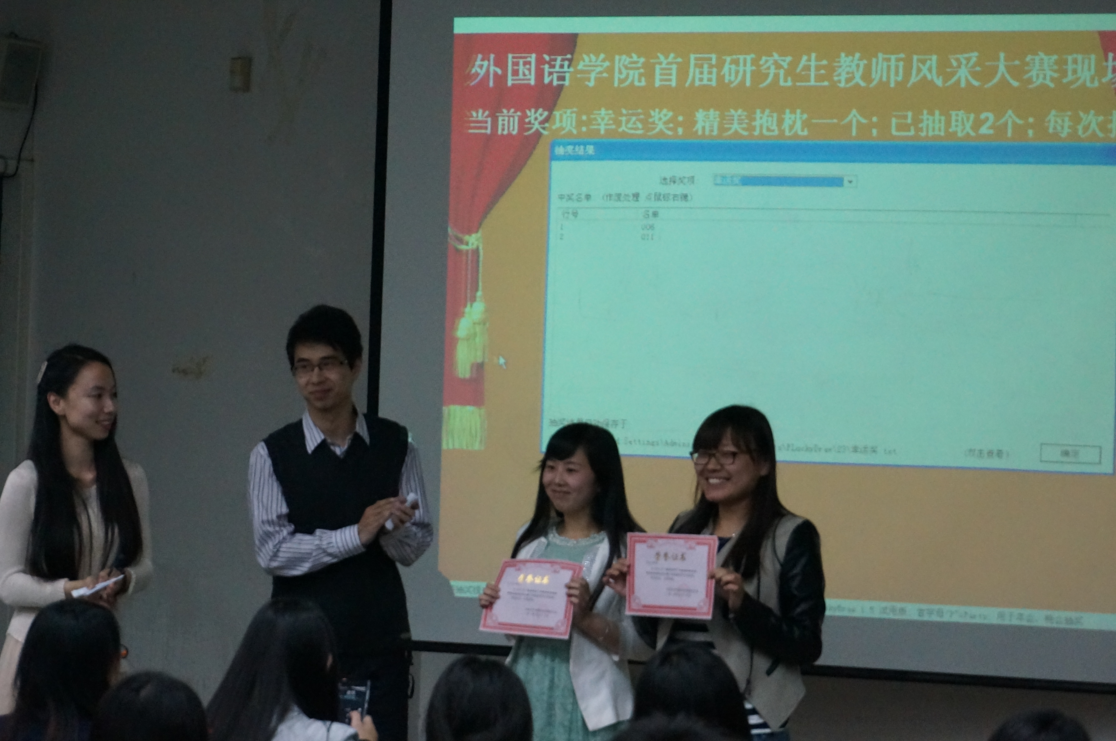 为了增强研究生的综合素质,提高研究生的实践能力,澳门金沙娱乐城app 于5月15日18:00在逸夫教学楼第六阶梯教室举办了“慎思笃行”澳门金沙娱乐城app 首届研究生教师风采大赛。澳门金沙娱乐城app 2013级研究生与本科生代表参加了比赛。 本次大赛分为初赛和决赛两个环节。经过初赛的选拔,八名同学进入到决赛现场。本次决赛中,每名选手有十分钟的现场授课时间,最后由评委根据每名选手的现场表现进行评分和点评, 并且由20名本科学生选出最受学生欢迎的两名教师。决赛中选手们精彩而睿智的现场表现获得了评委老师和现场观众的一致好评。最终,经过评委打分和学生现场投票,2013级西班牙语语言文学专业苑雨舒获得一等奖,2013级英语语言文学专业徐杨、亚非语言文学专业范慧杰获得二等奖,英语语言文学专业李英菀、日语语言文学专业唐家林、俄语语言文学周磊获得三等奖。 外语专业研究生很大部分有未来从事教师行业的意愿,本次活动为学生提供了一个展示自我风采的平台,提升了学生综合素质和实践能力。同时,通过评委们的点评指导和现场观众的意见反馈,同学们了解了自己的实力和弱点,为下一阶段的学习提供了方向。
