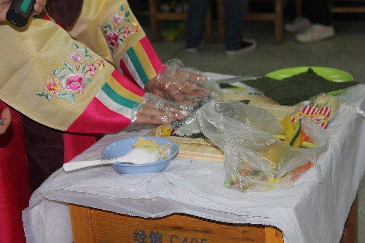 本次活动主要以制作紫菜包饭为主,经过爵士舞以及韩国的流行街舞等节目作为整场活动的序幕,接下来进入了本次活动的主题——制作紫菜包饭。由制作紫菜包饭的专业人士着韩服为我们演示如何制作紫菜包饭。使同学们对于制作紫菜包饭有了初步的了解。并调动大家自己动手制作紫菜包饭。现场气氛一度热烈。在欢声笑语过后,由协会内部的一个魔术师为我们带来了精彩的魔术表演,活动又迎来另一个另一个高潮。
