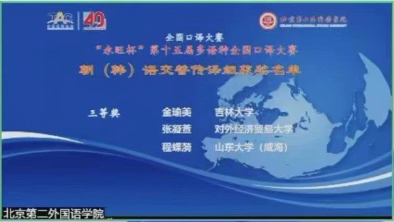 2021级朝鲜语口译专业金瑜美同学在高手如云的竞赛之中,克服了抽签顺序不利等因素,凭借着扎实的专业语言基础、强大的心理素质,一路披荆斩棘,过关斩将,得到了一众评委的广泛认可,在15位参加复赛的选手中取得了全国第四名、竞赛三等奖的优异成绩。