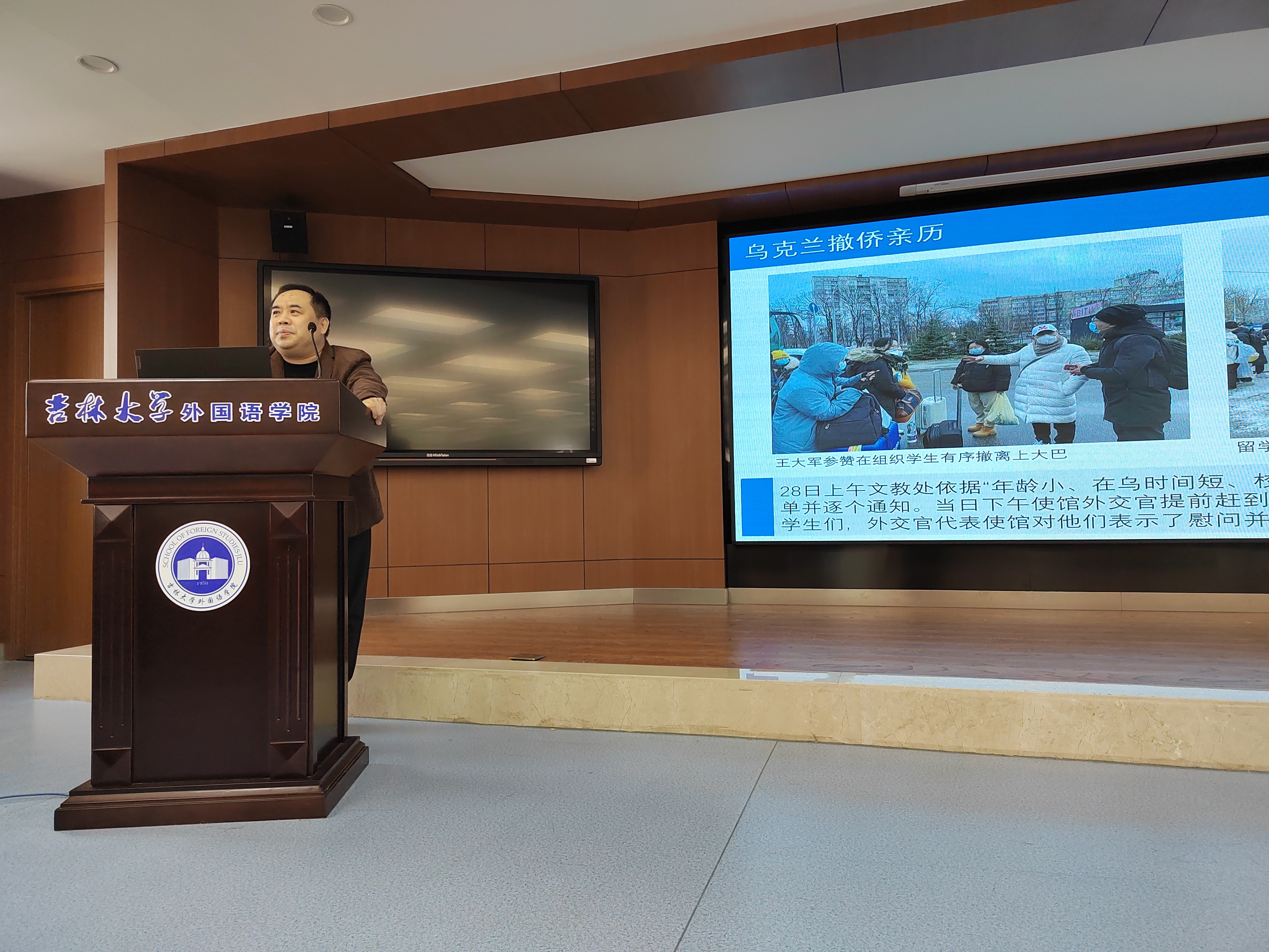 俄文系邀请原中国驻乌克兰大使馆教育参赞王大军做“祖国永远在你身边:乌克兰撤侨经历”讲座。讲座由吉林大学俄语系主任李丽老师主持,参加讲座的人员还有吉林大学俄语系及公共外交澳门金沙娱乐城app