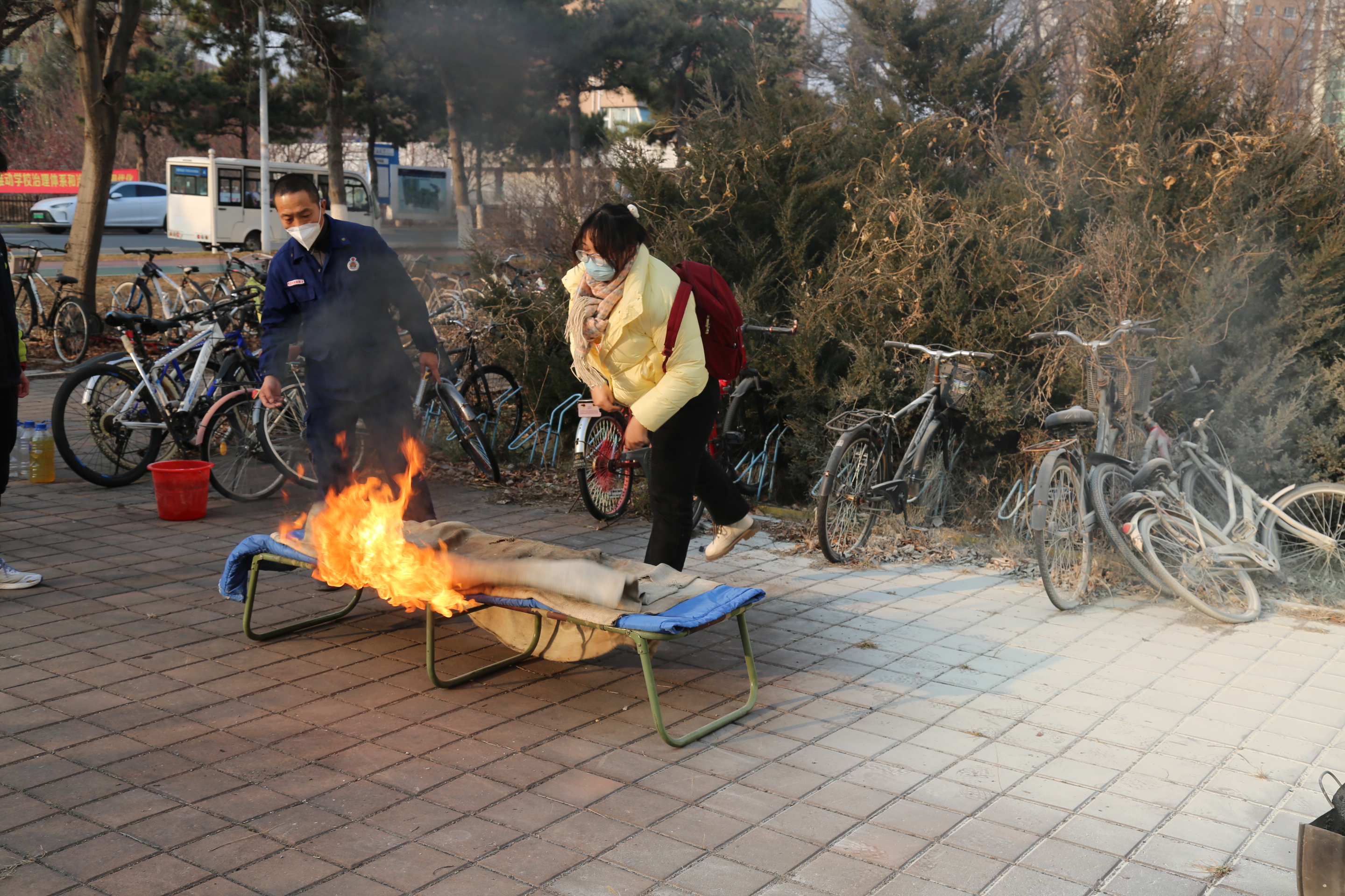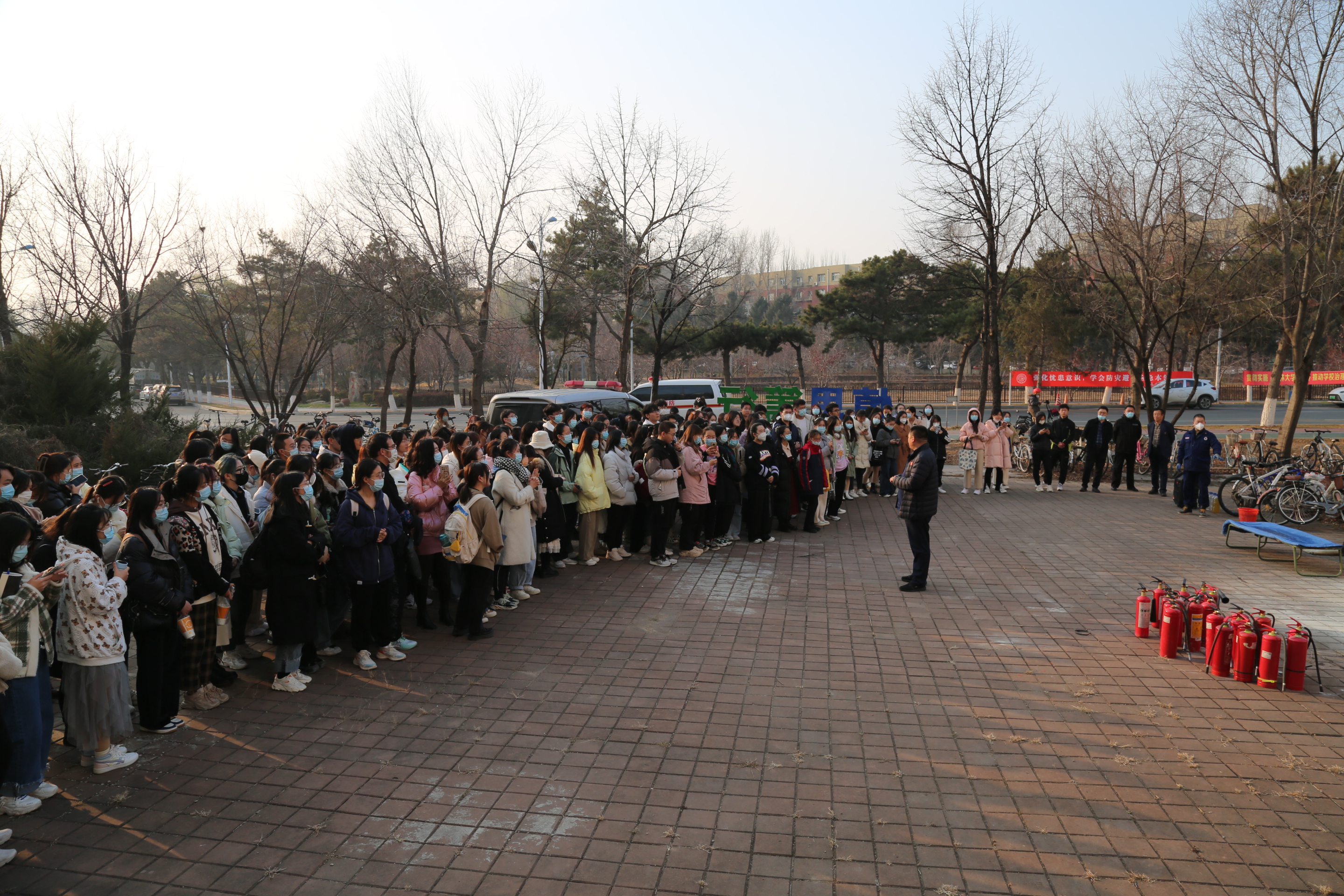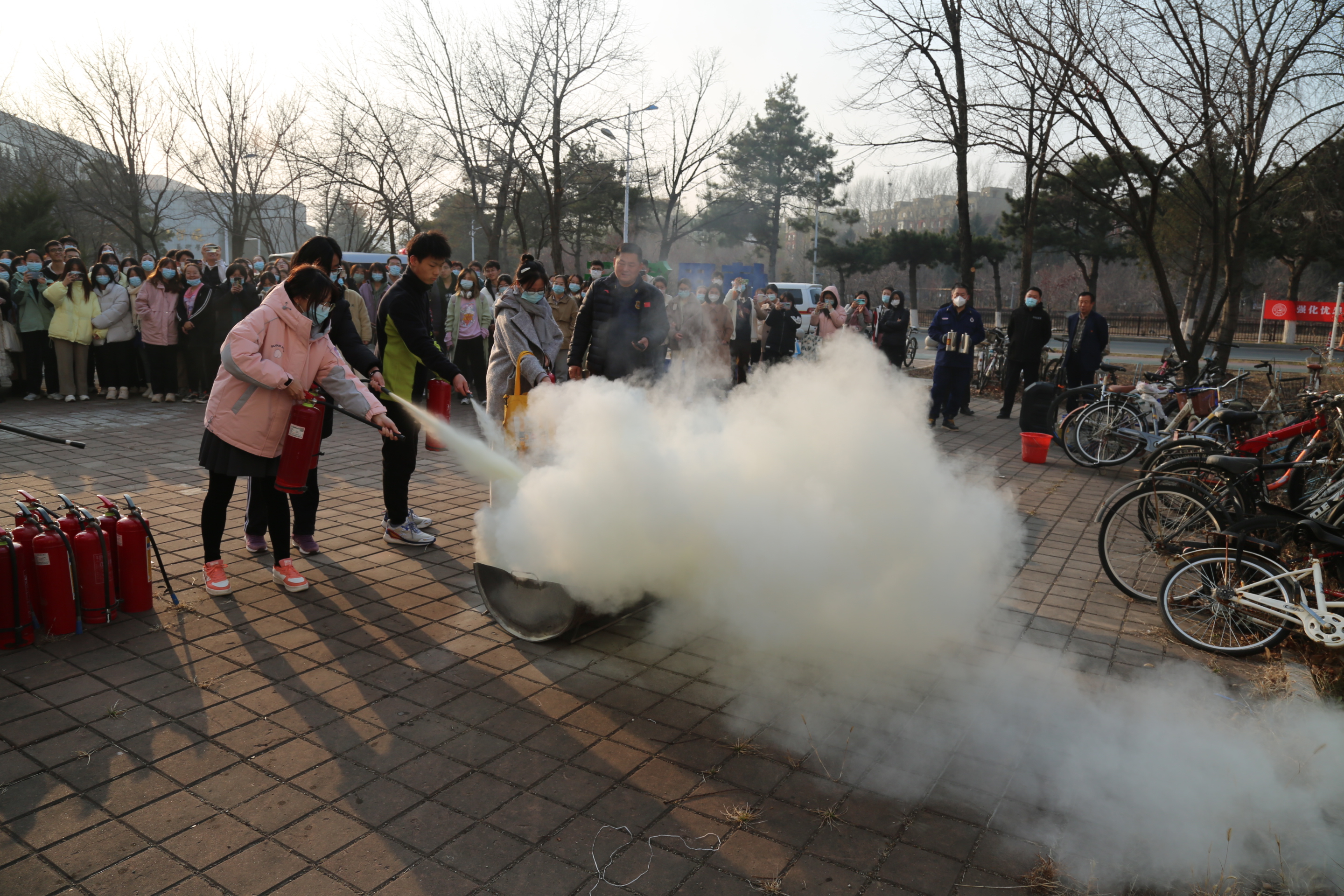 师生进行了消防疏散演练,分别演示了灭火器、灭火毯等消防器材的使用方法,并带着现场师生进行了实际操作,使师生们真正掌握了逃生技能与灭火要领。