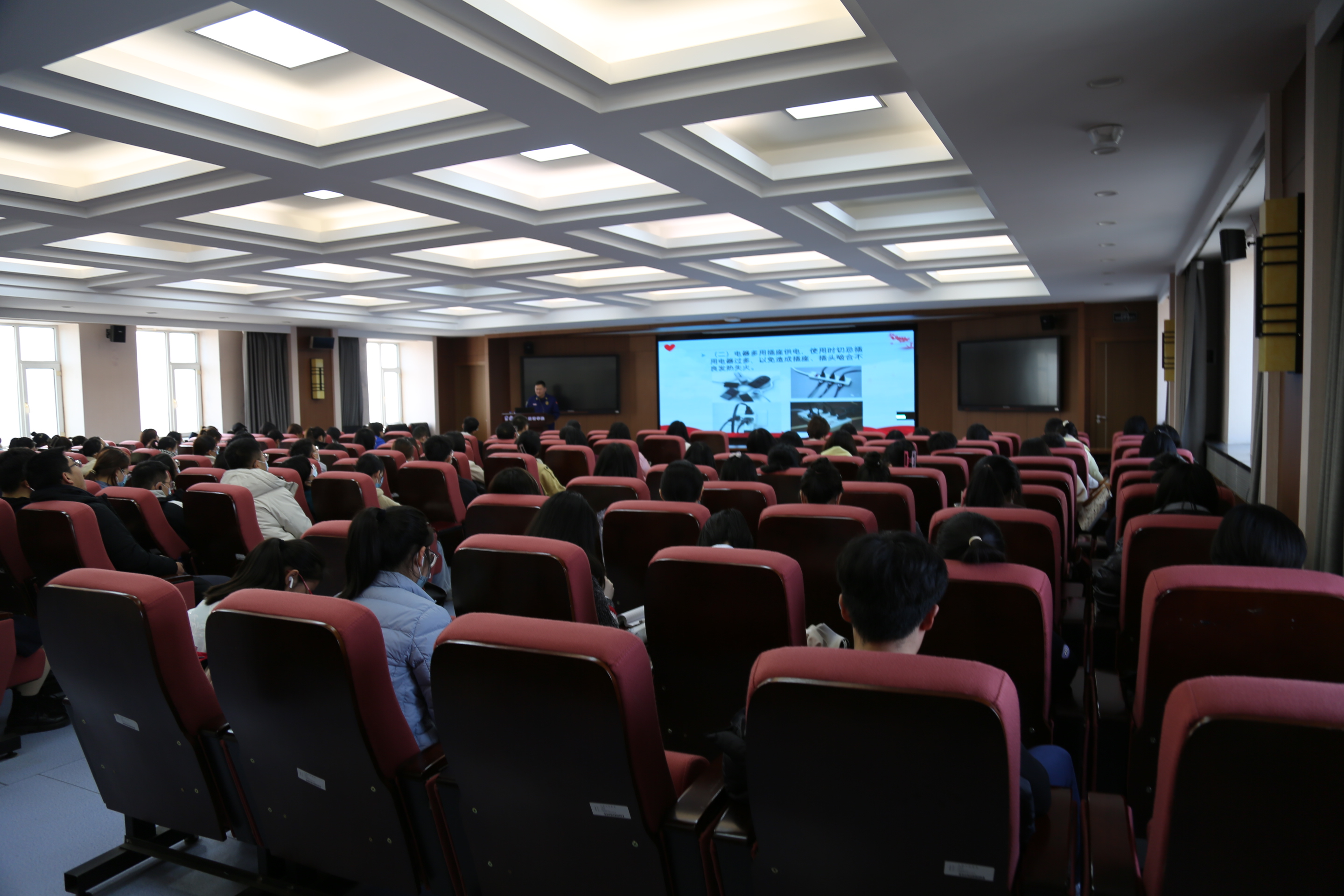 讲座中,消防科副科长董立明以自己丰富的消防安全工作经验,理论联系实际,结合典型的案例和高校易发生火灾的隐患,从校园消防安全管理规定及落实高校防火工作责任、灭火器材的使用、逃生自救的方法等方面做了详细的讲解。同时根据高校里教学、科研、实验等实际工作特点,教工和学生人员密集,用电量大,潜在着火灾隐患现实情况,董立明副科长还列举了一些近年来发生在高校的火灾实际案例,并按火灾发展的规律,分别介绍了在火灾发生时的逃生自救方法,同时现场演示了几种常用灭火器材的使用方法。听课的师生们掌握了有关安全防火方面的知识,强化了安全防火意识,受益匪浅。