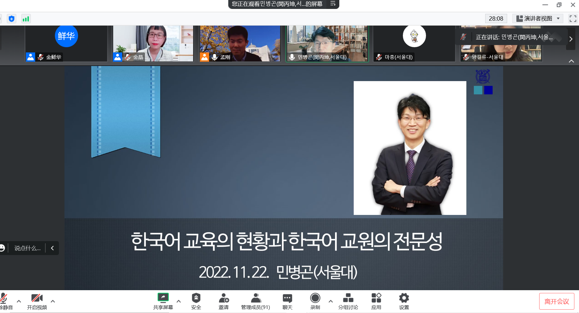 朝文系邀请,2022年11月22日19时,韩国语教育学会会长、韩国教育课程评价院研究咨询委员会委员长、首尔大学国语教育系闵丙坤教授通过腾讯会议进行了一场主题为“韩国语教育的现状与韩国语教师的专业性”的学术讲座。本次讲座由澳门金沙娱乐城app