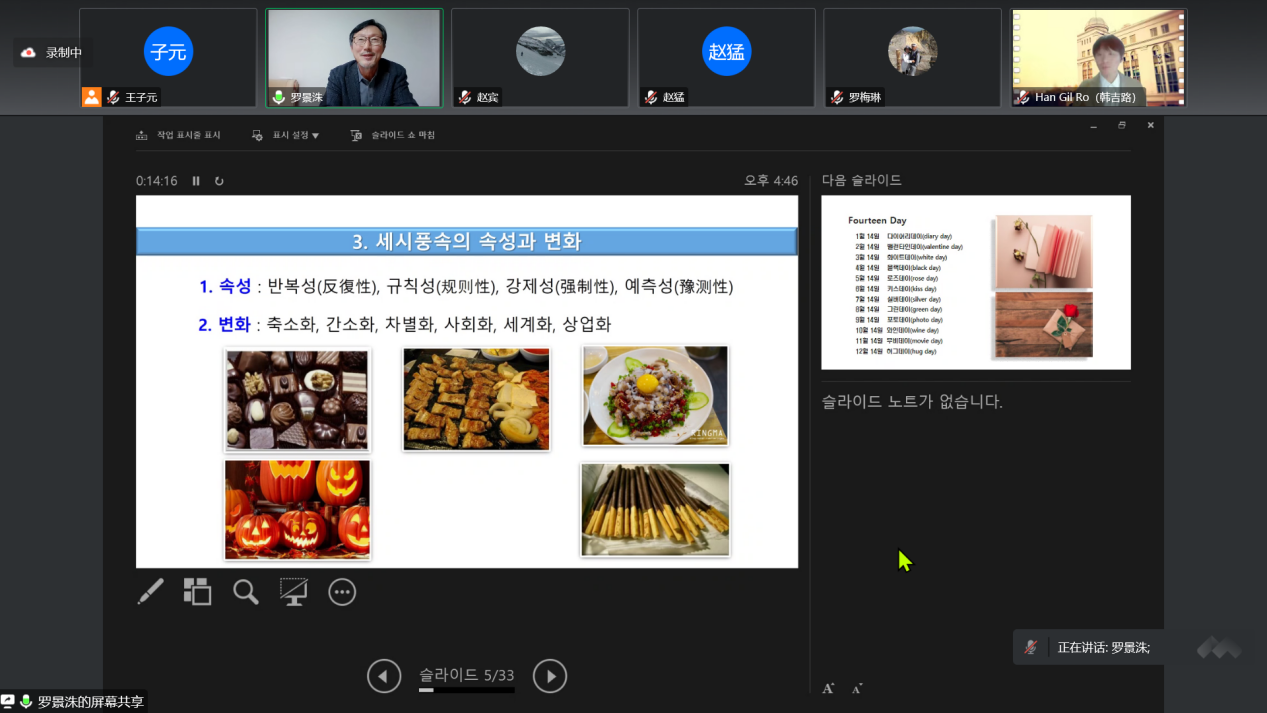 罗景洙教授精心准备了本次讲座。本次讲座主要从礼仪、游戏、饮食等为代表的岁时风俗出发,从而更好地理解韩国的文化以及韩国人的生活方式和思考方式。随着传统的社会结构和文化基础指向新的方向,岁时风俗也在逐渐发生变化。本次讲座也指出要在理解韩国代表性节日和韩国固有的岁时风俗及其最近变化情况的同时,更要深入了解韩国人的生活文化。